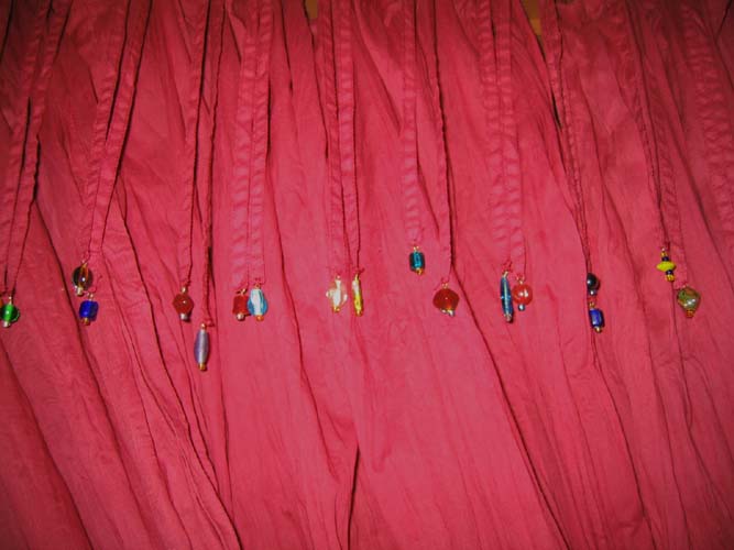 yesterday during the heavy rains, I spent the day beading the ties at the tops of the curtains on the door