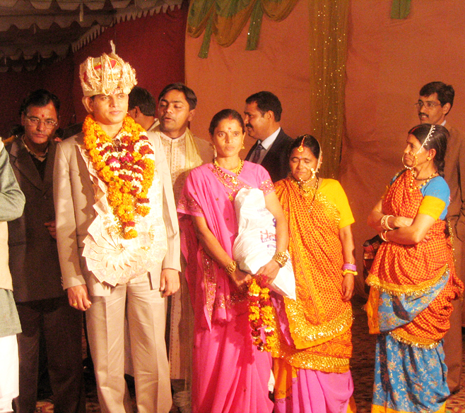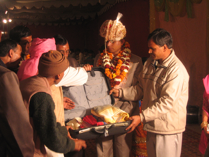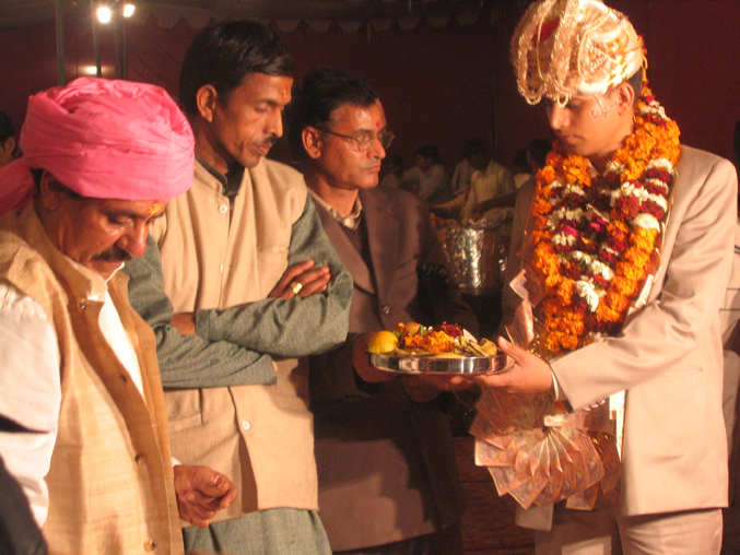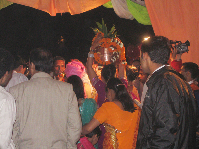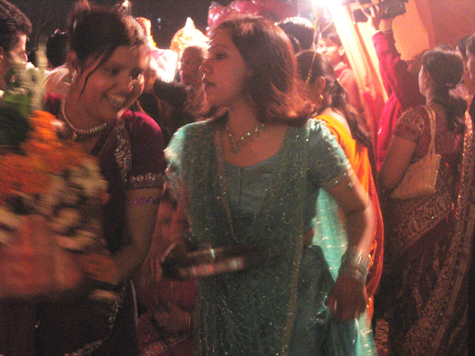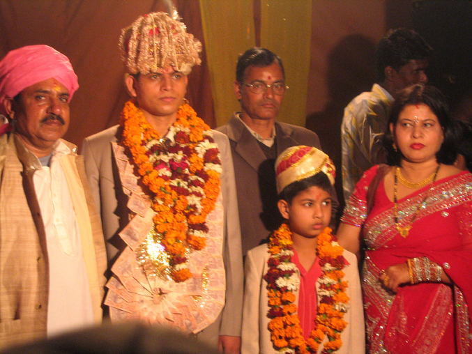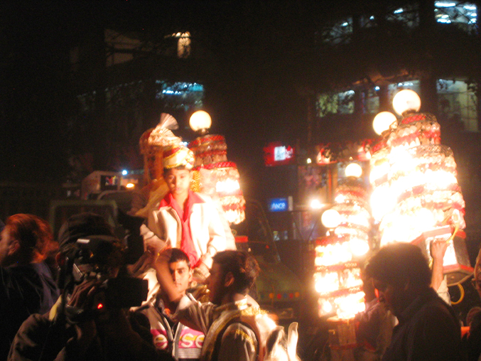 the groom arrived on his white horse with the red and white fluorescent lights in procession and the wedding band, his family dancing madly around them and money being given on all sides for the new couple. I'm not sure if the young boy sitting in front of the groom on the horse was a younger brother or not