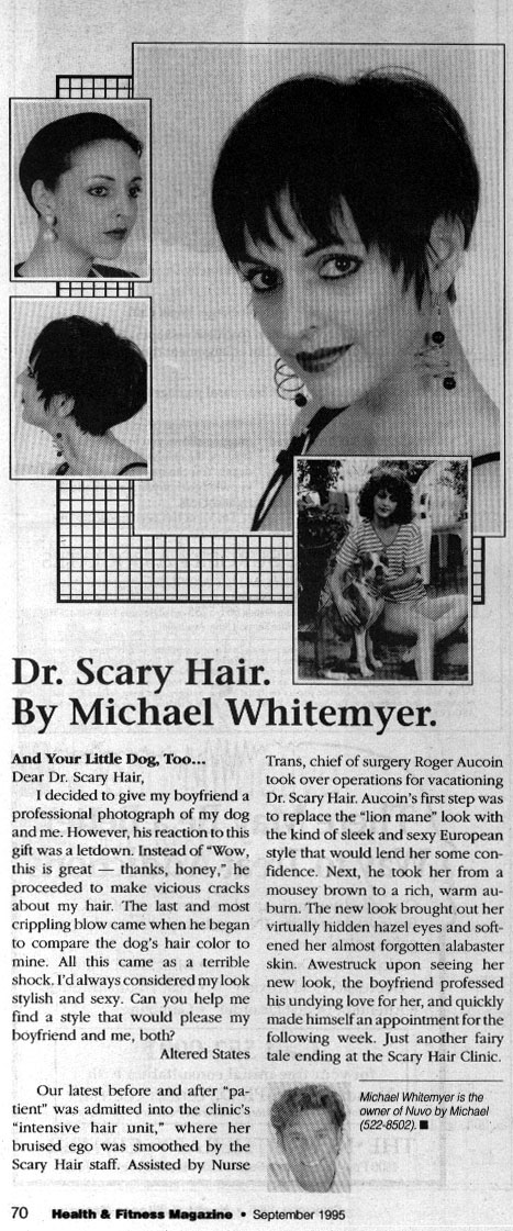 Health & Fitness ad September 1995 - I did this advertisement for my hairdresser. Those guys were quite funny. The "before" picture in the inset is not even my real hair! It was one of their client's wigs that they were styling. Of course the whole tragic story and letter were completely made up. My hairdresser at that time Roger Aucoin has passed away. He was really a nice person and is missed.