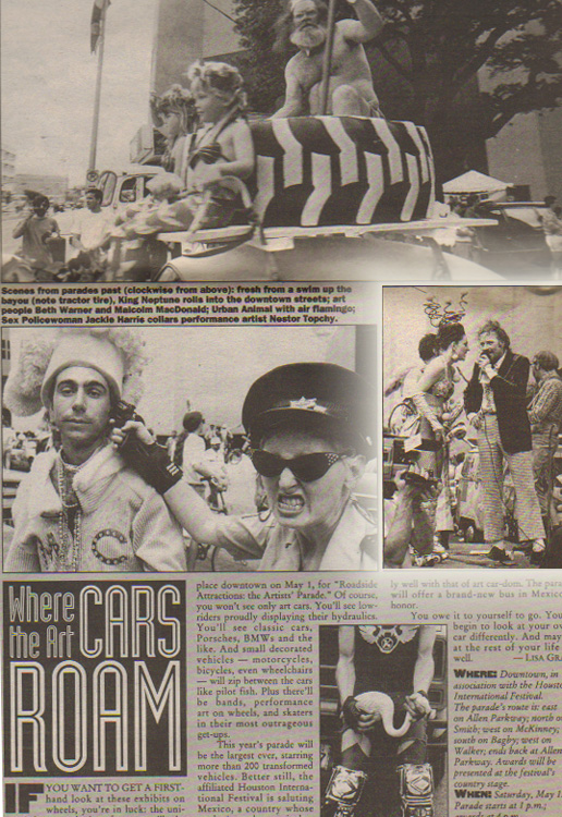 Public News, April 29, 1993 - Malcom and I fighting in a little bit of rolling performance during the 1993 Art Car Parade. We're in the photo on the right side of the center of the page.