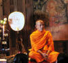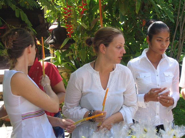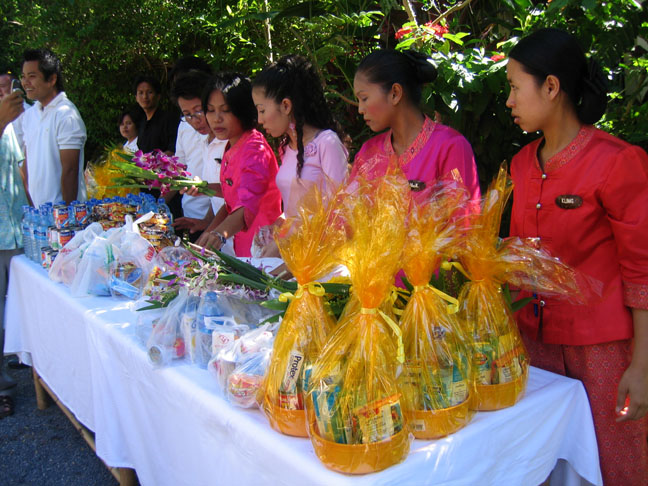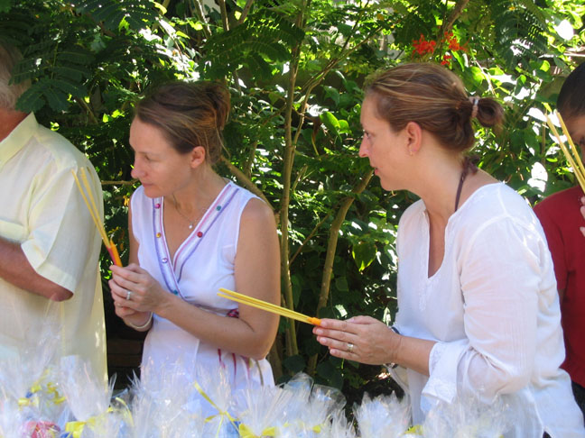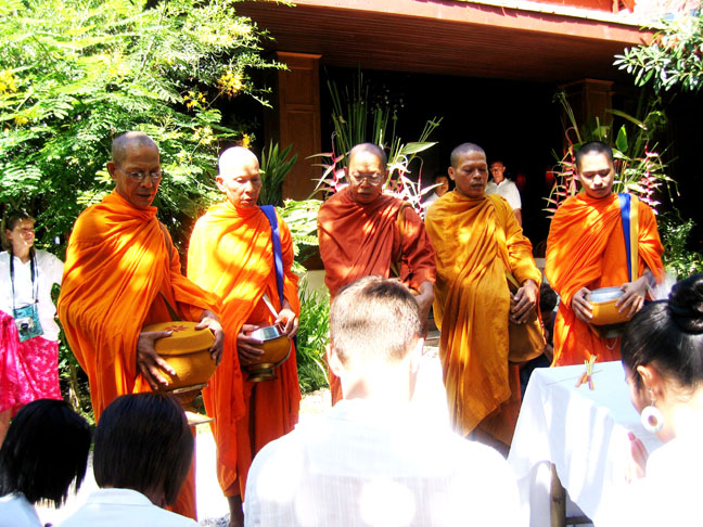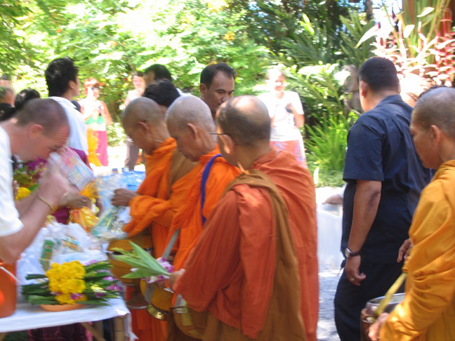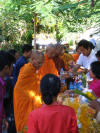 the monks arrive and do some chanting and we hand out the gifts, never directly into the monk's hands but into his carryall and it must be given with both hands, we place bundles of candles, incense and food and water into their baskets